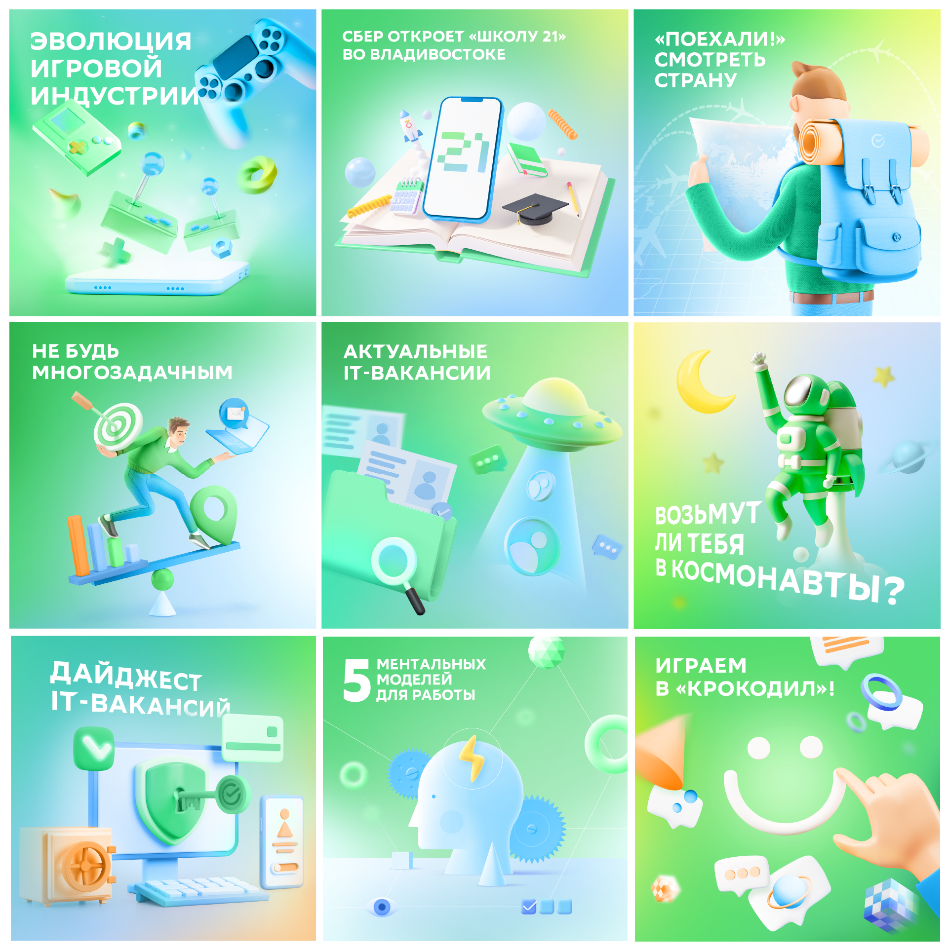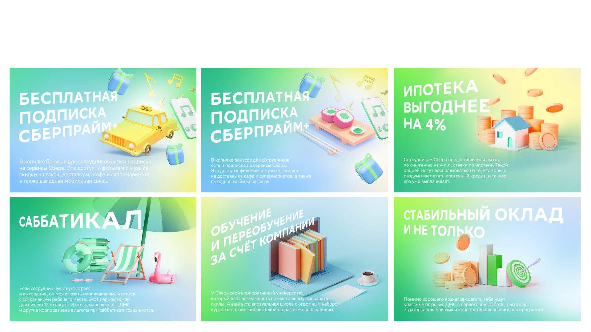 Working as Art Director with Sberbank's HR team, I crafted captivating main visuals and defined their brand identity for over a year. Throughout the project, I skillfully blended 3D shapes, photos, and typography to create captivating visuals. It was a hugely successful journey, constantly improving our style and achieving great heights together. Our year-long collaboration resulted in a refined brand identity and meaningful creative work."
